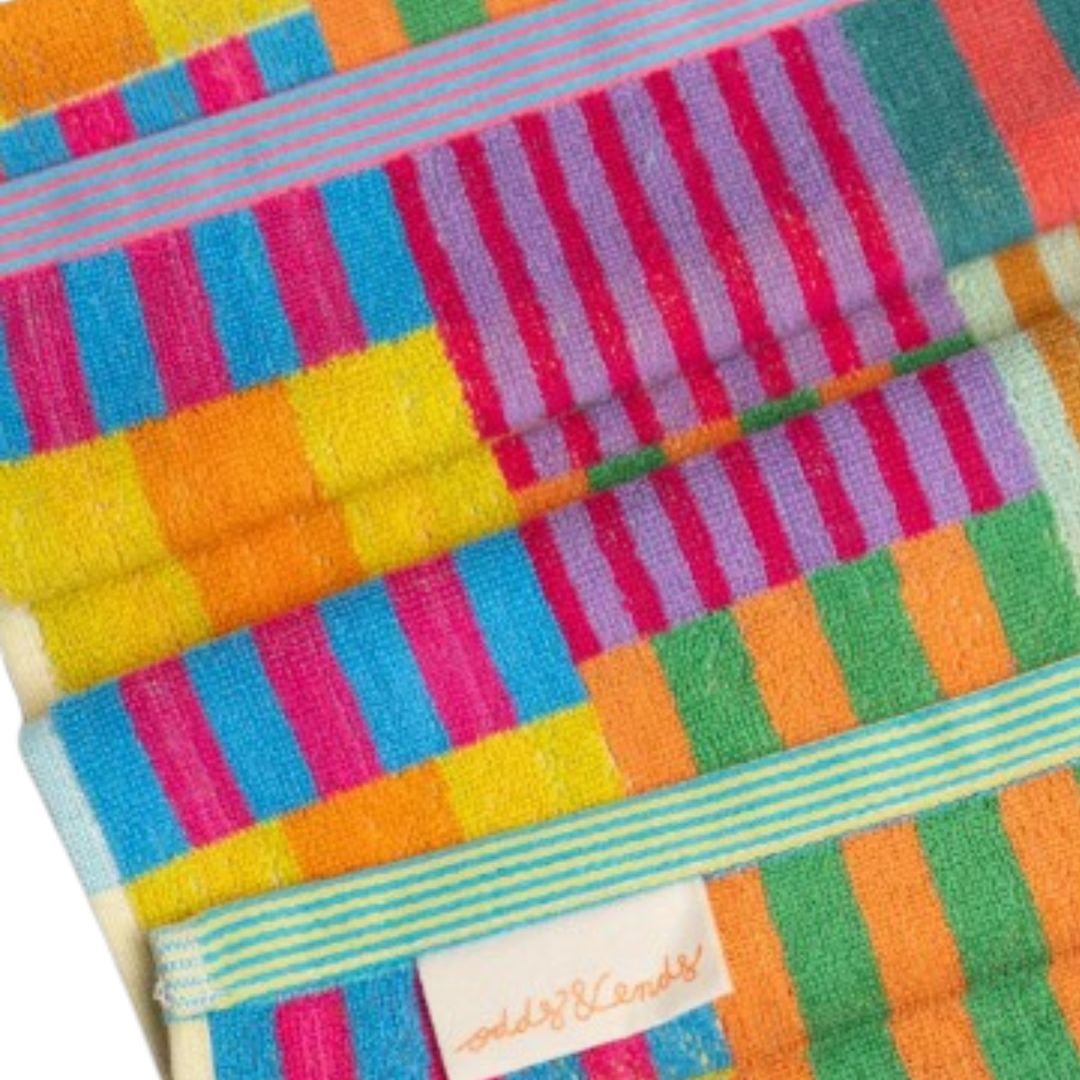 Wanneer fabrieken garens verven om textiel te weven, produceren ze vaak iets meer dan nodig – voor de zekerheid. Deze restgarens blijven meestal ongebruikt. De Odds & Ends collectie geeft ze een tweede leven en vormt er unieke, onverwachte kleurcombinaties mee. Een zachte, absorberende handdoek met een speels en kleurrijk design – perfect voor dagelijks gebruik én vriendelijk voor de planeet.