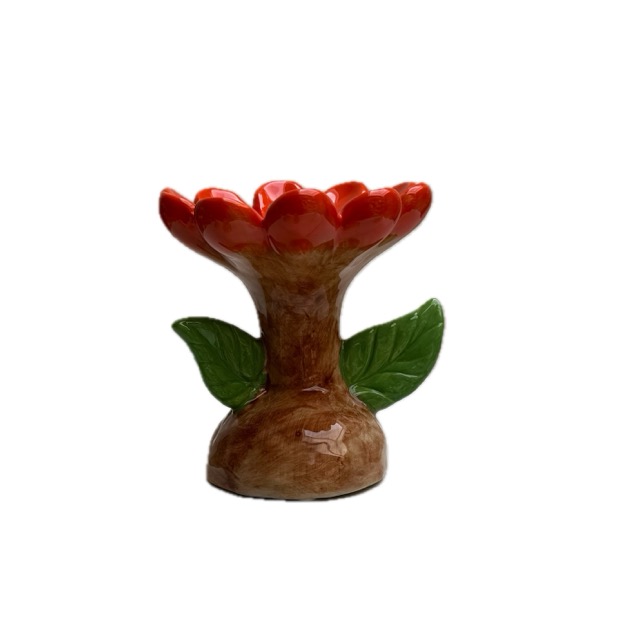 Vrolijke kaarsenstandaard in de vorm van een bloem in de kleur oranje. Een prima aanvulling in een kleurrijk interieur, dat ook zonder kaars erin erg leuk is om te zien.