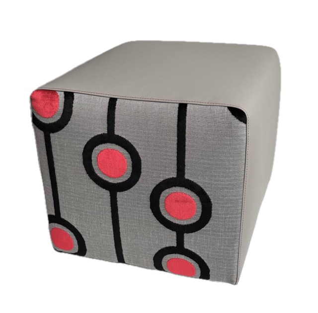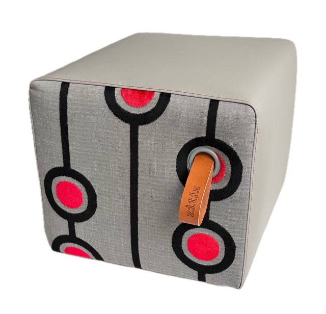 Een ZITIZ poef gemaakt van lichtgrijze meubelstof in vrolijke dessin met rode cirkels. De bovenzijde, het zitgedeelte is van lichtgrijs leer. Met een leren lus-label van ZITIZ. Hiermee trek je de poef zo naar de bank toe. Superhandig om je voeten op te leggen of als extra zitplek. Met een dienblaadje erop ook handig als bijzettafeltje te gebruiken.