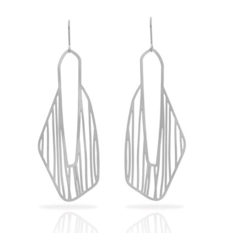 Bijzonder leuke verzilverde oorbellen, Lumen van het Spaanse merk Ras. De redelijk grote hangers hebben hoekige vormen met lijnen.