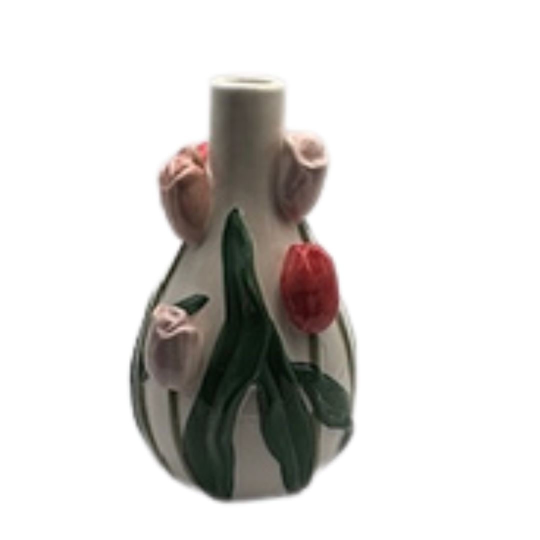 Stijlvolle vaas, Tulipa met rondom voorzien van Tulpen. De tulpen liggen er, net als bij een bos tulpen boven op. Super leuk met een paar tulpjes of zo als decoratief item in je interieur.