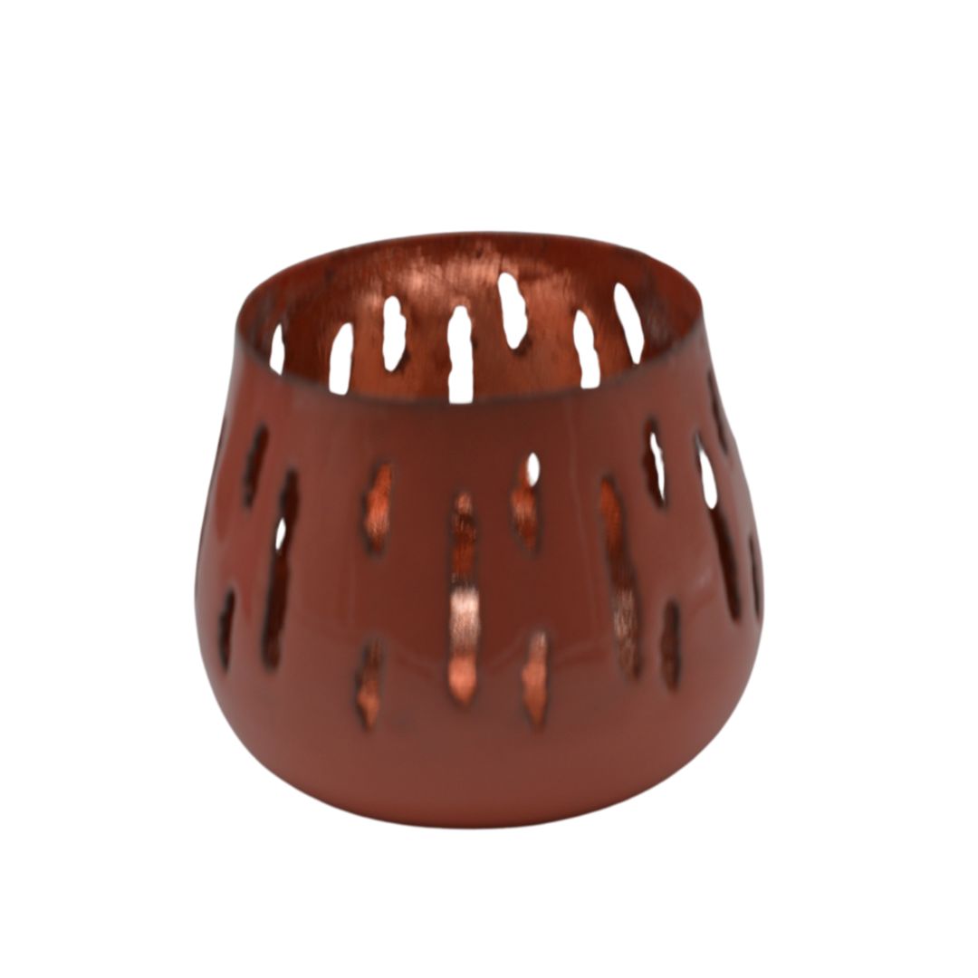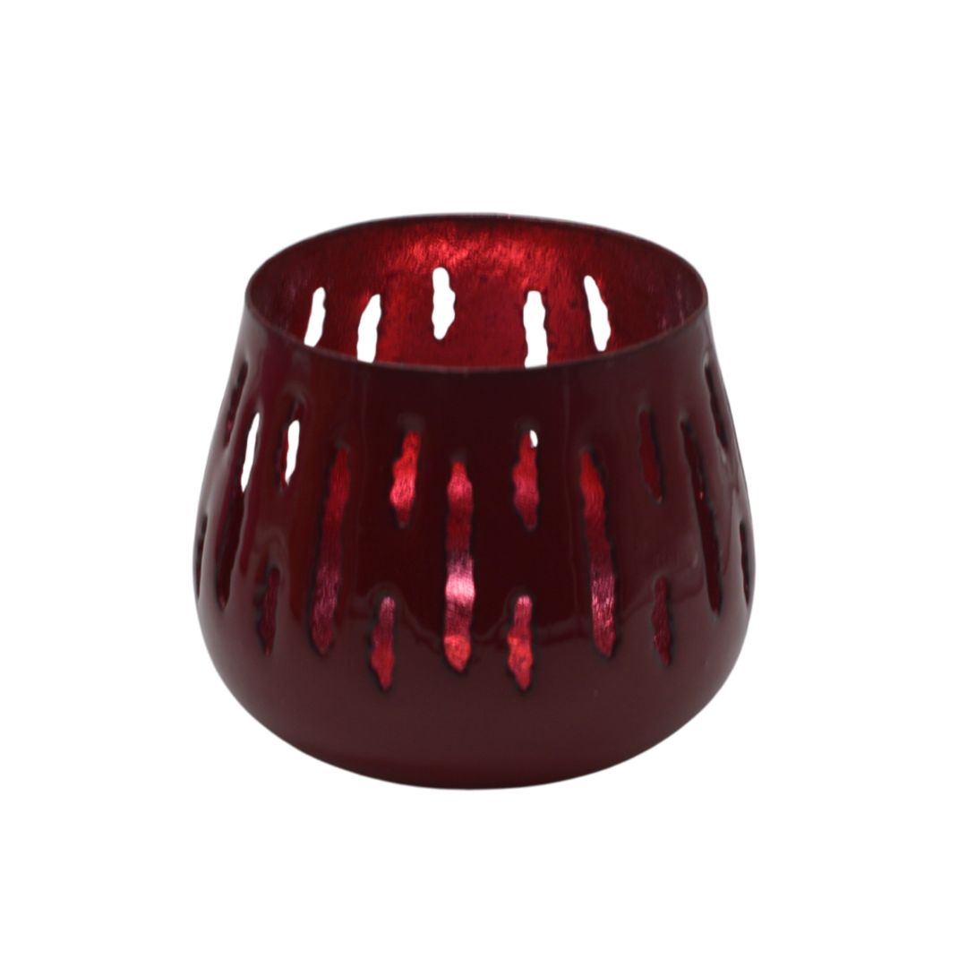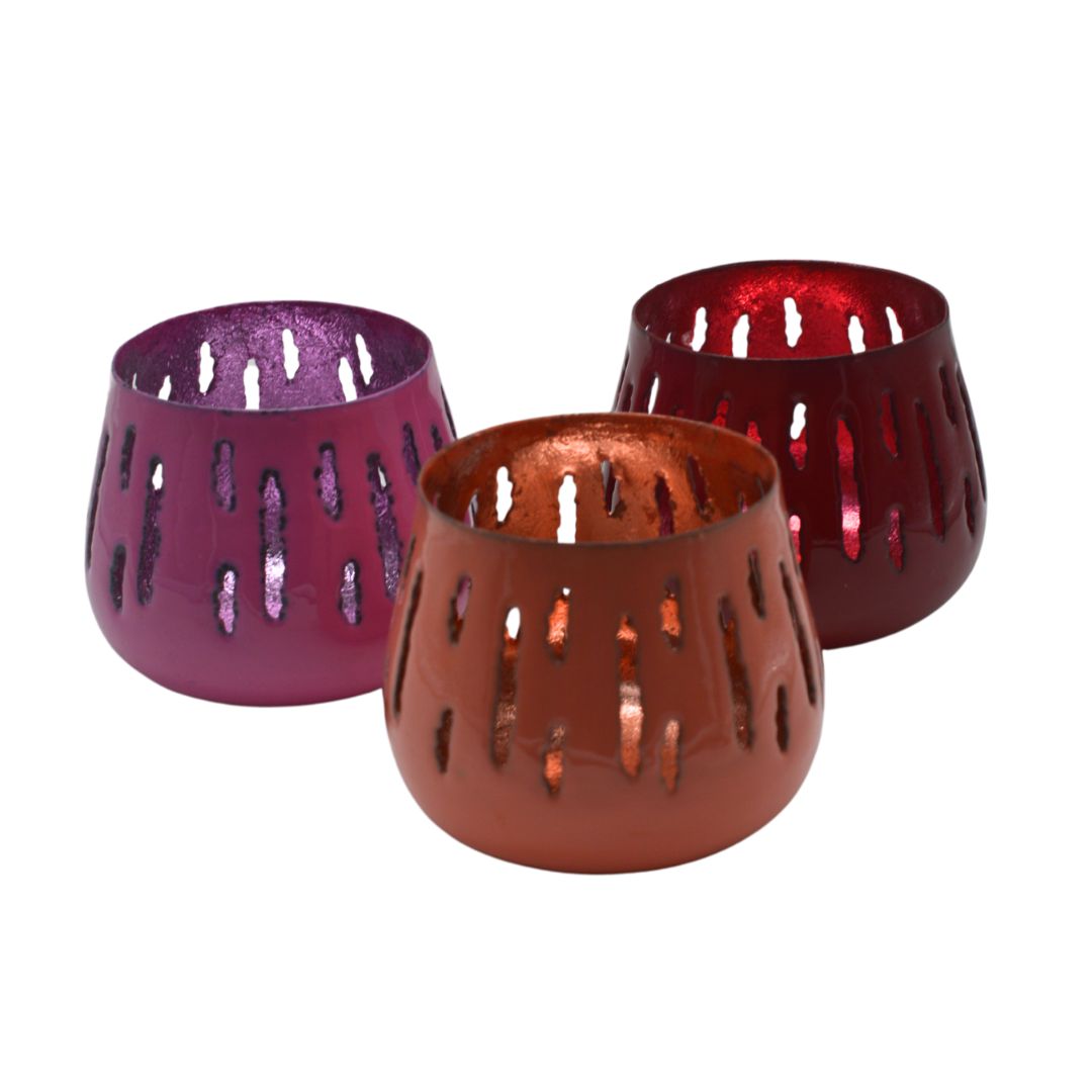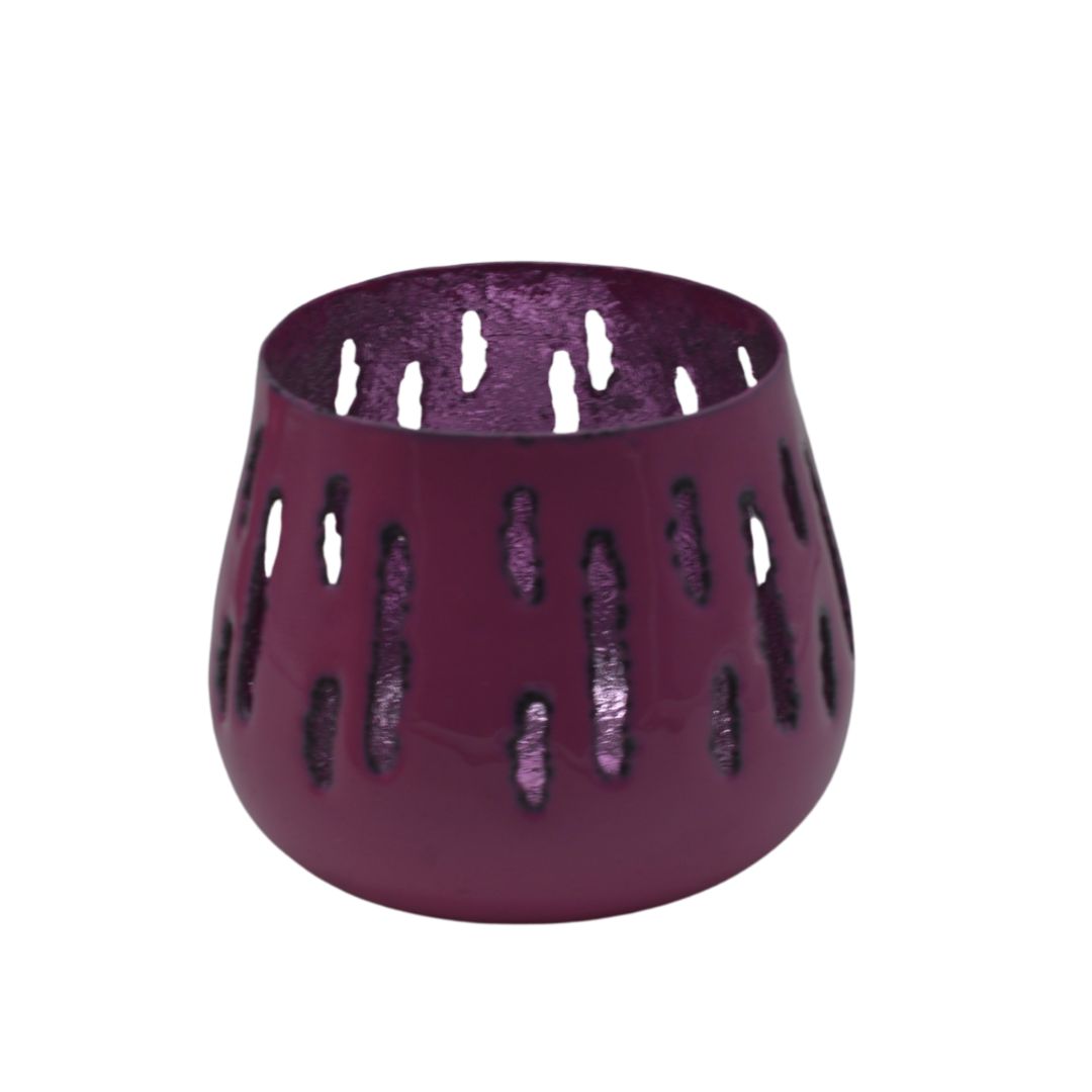 Mooie metalen windlicht in vrolijke kleuren. De binnenzijde is in dezelfde kleur maar dan metallic gespoten voor een mooie reflectie van het waxinelichtje. Rondom is een mooi langwerpig dessin uitgestanst zodat het kaarsje extra mooi doorschijnt. Verkrijgbaar in drie kleuren.