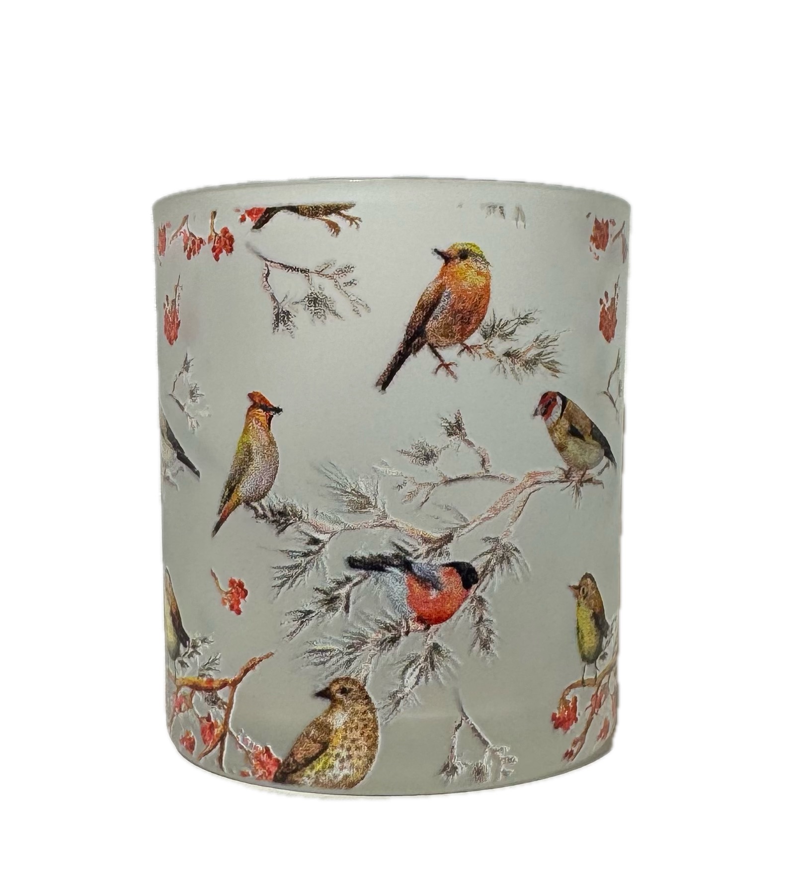 Fleurig windlichtje van glas met allemaal verschillende vogeltjes.